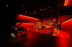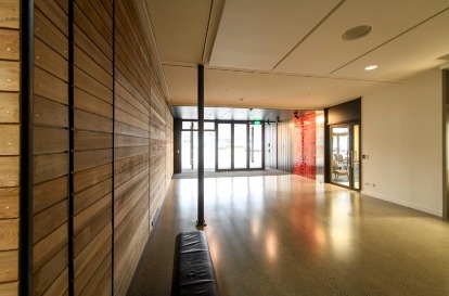 A beautiful modern meeting space, featuring classy red tiles and wooden floor.